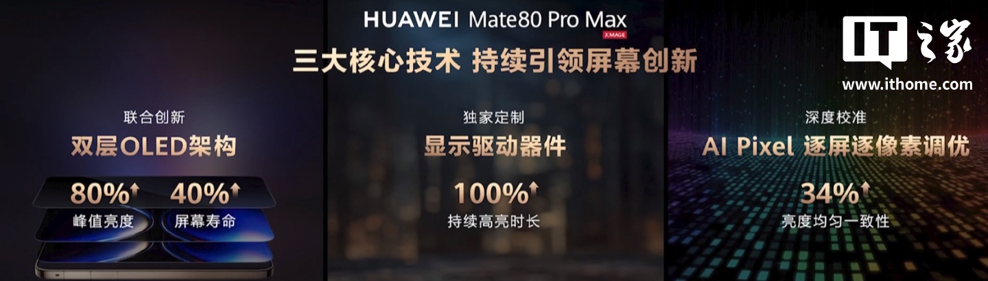 IT之家注意到,灵珑屏采用双层 OLED 架构,上一代 Mate 70 系列是 RS 非凡大师版本独享,Mate 80 系列下放到了 Pro Max 版本中,且峰值亮度大幅提升。