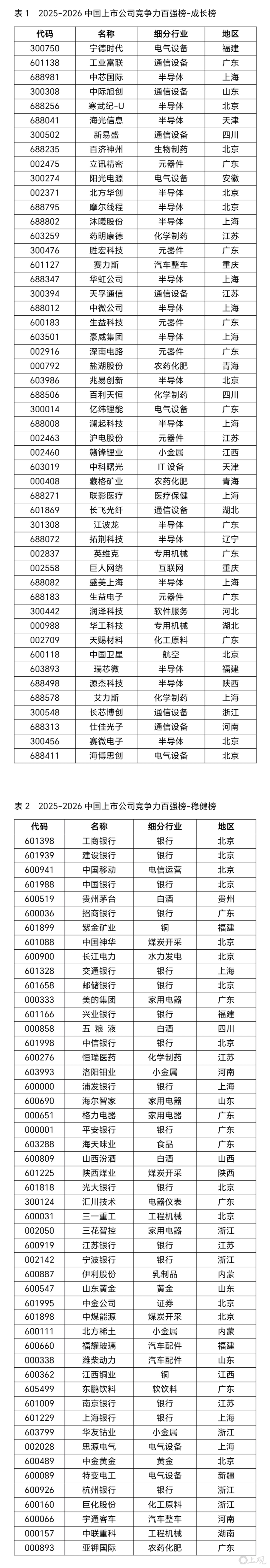 根据两分“风格”,中国上市公司竞争力百强榜分为“成长榜”50强与“稳健榜”50强。其中,“成长性”更注重企业成长空间和产业发展趋势,榜单公司主要分布于新兴优势产业,如半导体、人工智能、机器人、商业航天、医药医疗、新能源等相关科技属性行业。“稳健性”,则相对注重业绩稳定、现金流良好、高股息率等,榜单公司主要分布于银行、食品饮料、交通运输、煤炭电力、家电等传统行业。